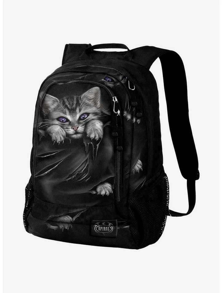 A cute kitten with purple eyes peeks out of the slashed top. Features breathable padding, keyholder, tech pocket, and 15″ laptop pocket.ย