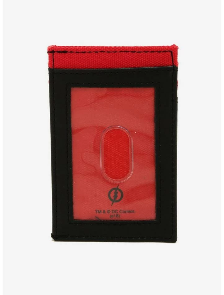Access your cards and ID as quick as DC Comics’Β The Flash with this convenient card wallet. Made of tough canvas and faux leather, featuring his logo in metal on the front, with 3 vertical card slots, 1 transparent ID window and 1 side slot for cards or cash.Β