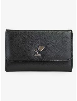 This Disney Pixar fold over wallet featuring a metal casted Luxo Jr lamp emblem is made from vegan leather. It measures 6.5 x 4.5 x 1.0 Inches and features 2 Large Pockets, 3 card slots, and 1 coin zipper.