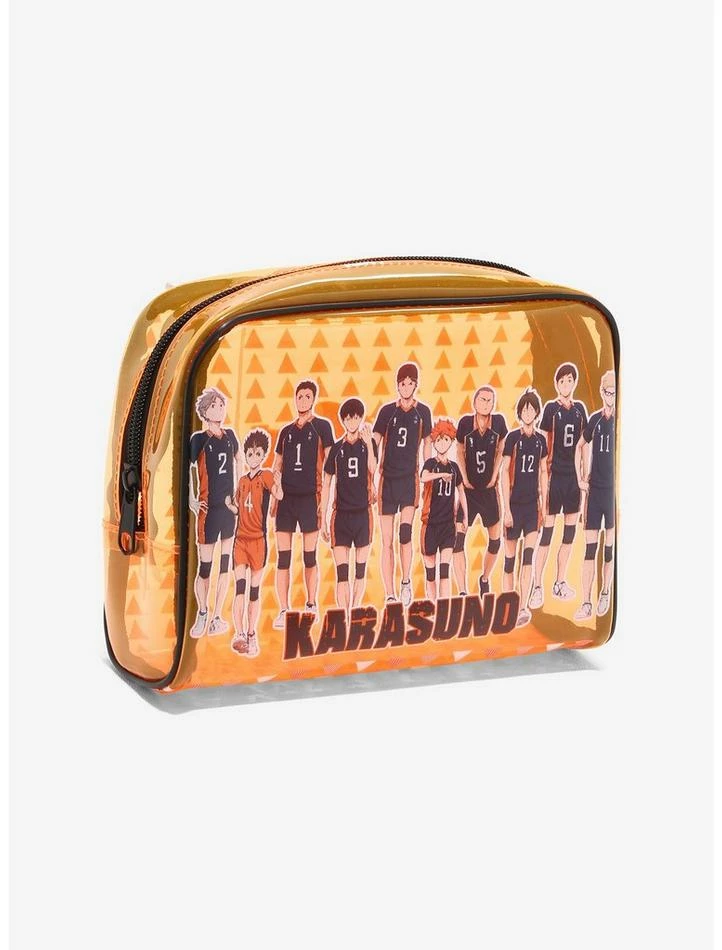 Rep your favorite volleyball club in this orange makeup bag fromย Haikyu!!ย featuring a Karasuno High School character and logo design.