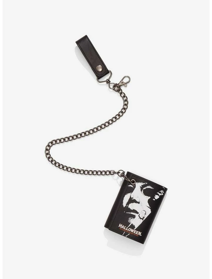 Keep your cash and cards on you as you try to outrun Michael Myers with this black trifold wallet featuring a Halloween: The Curse of Michael Myers design. It comes with a clear ID display, card slots, a billfold and a detachable chain. Double snap-button closure.