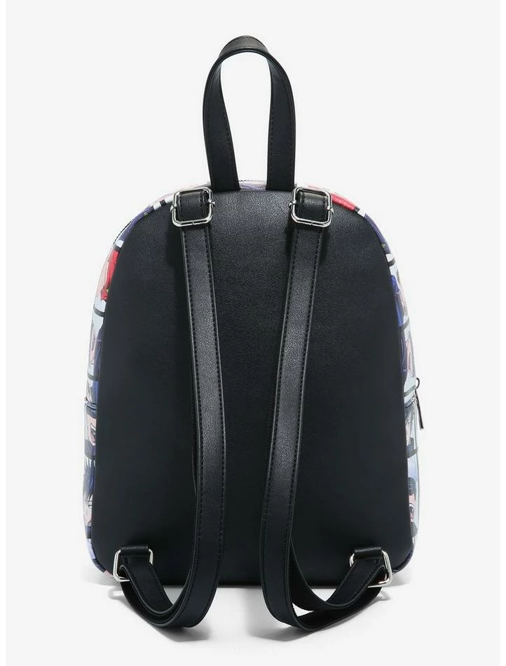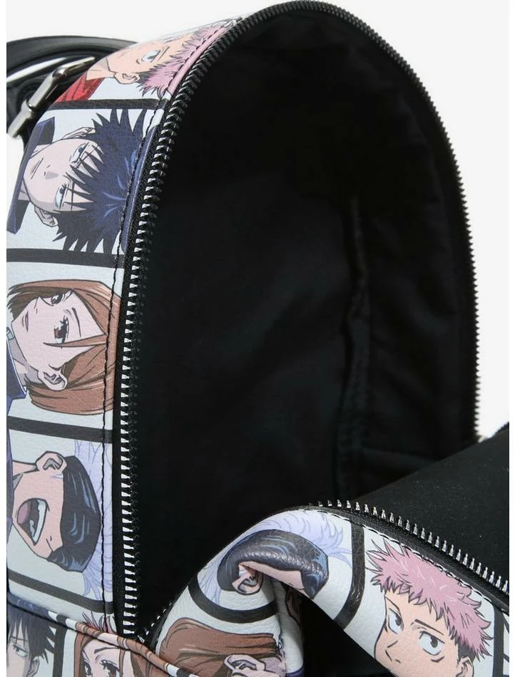 Heading out to exorcise some curses? You may need backup! Take first years Yuji, Megumi and Nobara with you, along with the their teacher, Gojo! This Jujutsu Kaisenย mini backpack features an allover grid pattern with your faves from the show, plus an embossed logo from Jujutsu High up top. Front zipper pocket, adjustable straps and silver tone hardware.