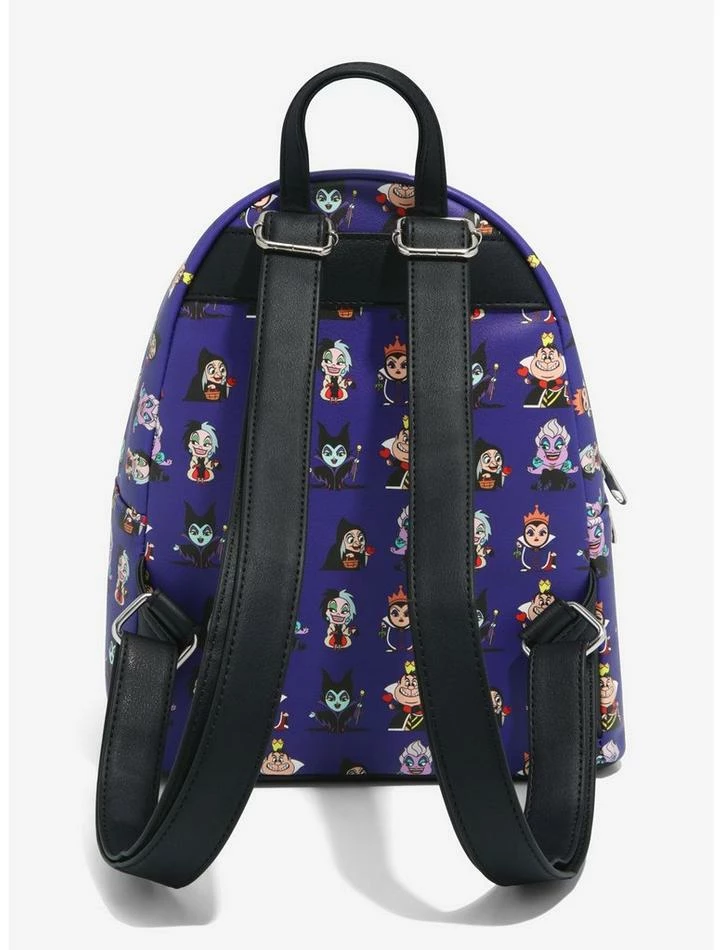 Sometimes it feels good to be bad. Carry around your essentials in a perfectly wicked way! This mini backpack features an all over print highlighting chibi versions of your favorite Disney villains, including Ursula, the Evil Queen, Maleficent and Cruella de Vil! Comes with adjustable straps, front zipper pocket, interior drop pocket and a top carrying handle.