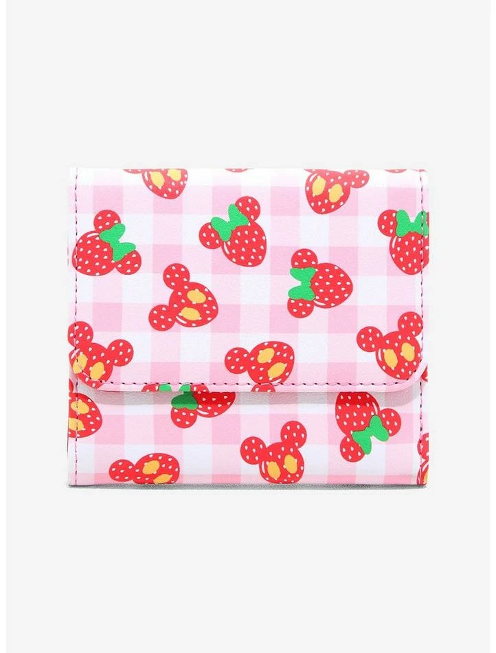 Carry around your essential cards in a berry cute way! This Disney mini flap wallet features a pink gingham pattern and an allover print of strawberries shaped like Minnie Mouse and Mickey Mouse.Β Comes with 6 card slots, a billfold and a snap-button closure.