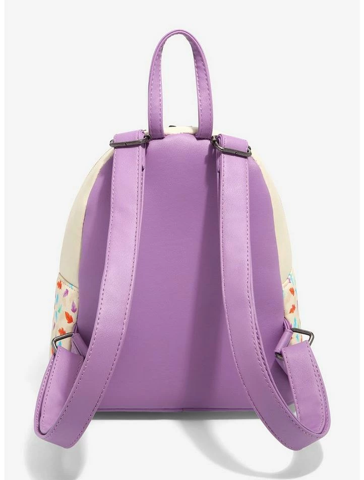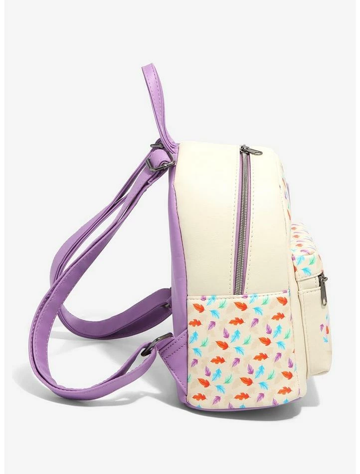 Make sure you bring your essentials with you before heading around the riverbend! This mini backpack fromΒ PocahontasΒ is painted with all the colors of the wind, with vibrant leaves floating all around the front and sides. A chibi Pocahontas, Meeko and Flit are illustrated on the front zipper pocket. Comes with an interior drop pocket, adjustable straps and gunmetal-tone hardware.