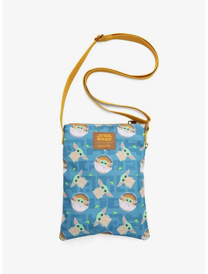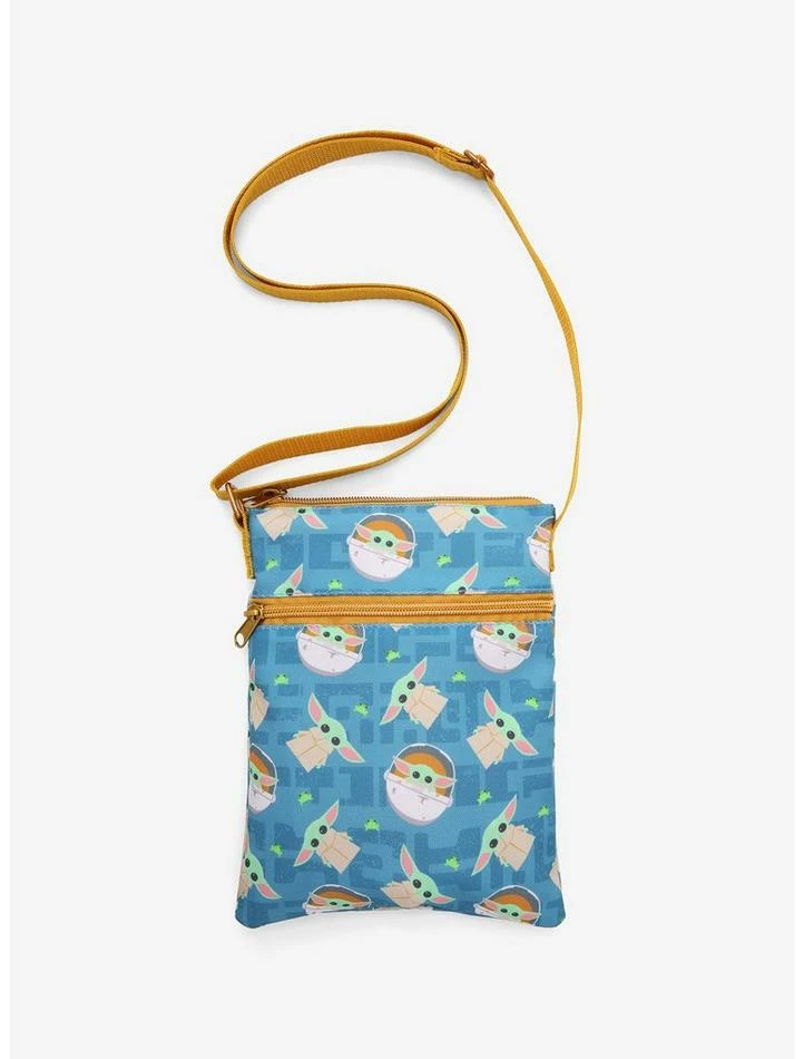 Travel light for your next intergalactic adventure with this passport crossbody bag! Big enough to hold your precious cargo, this crossbody bag features an allover print of chibi Grogu both in his Hover Pram and standing, with his favorite snack mixed in. Comes with a front zipper pocket, top zipper closure and adjustable crossbody strap.