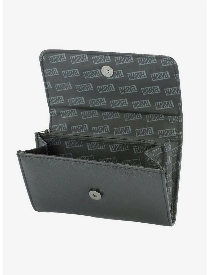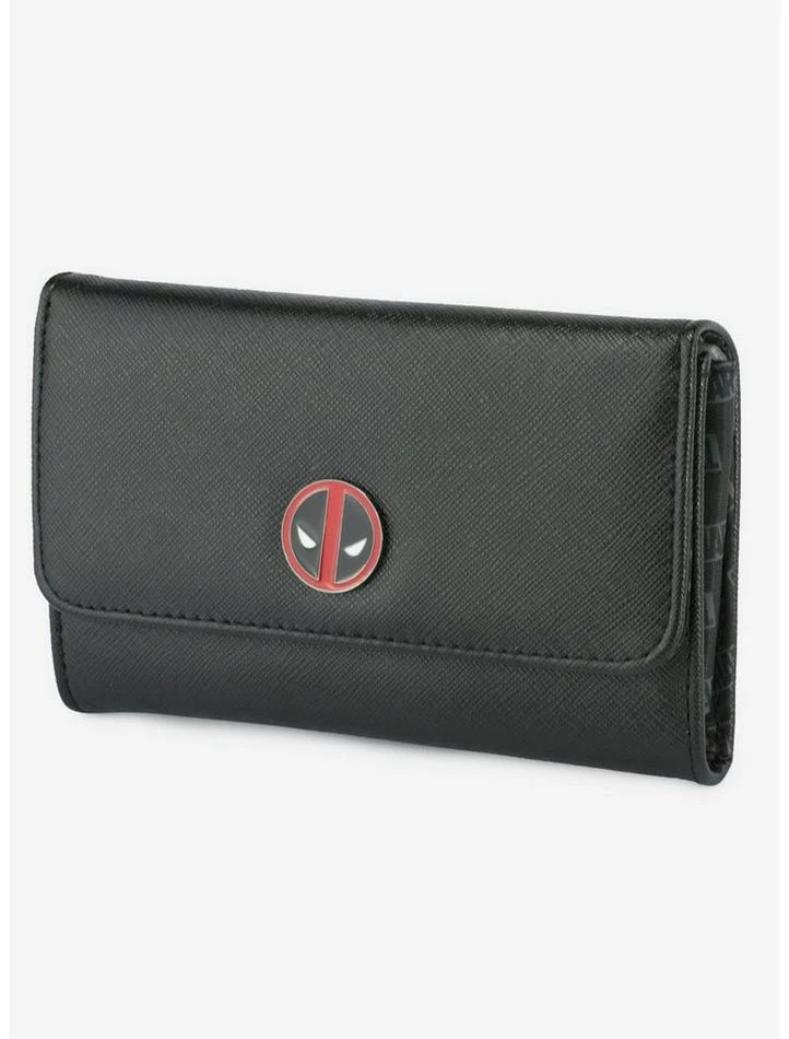 This Marvel Comics fold over wallet featuring a metal casted Deadpool Logo is made from vegan leather. It measures 6.5 x 4.5 x 1.0 Inches and features 2 Large Pockets, 3 card slots, and 1 coin zipper.