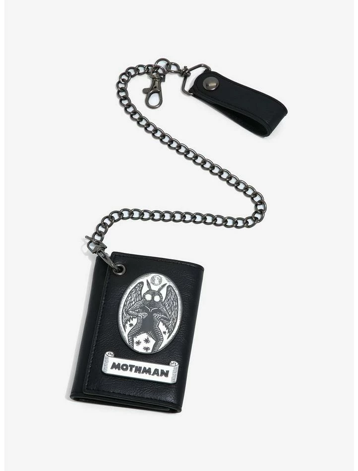 Would you trust Mothman to protect your cards and cash? Yes or yes? Rep your favorite cryptid with this trifold wallet, featuring an embossed portrait of Mothman by Brian Reedy, and its name on an embossed banner below. Comes with a clear ID display, 5 card slots, a billfold and a detachable chain. Double snap button closure.