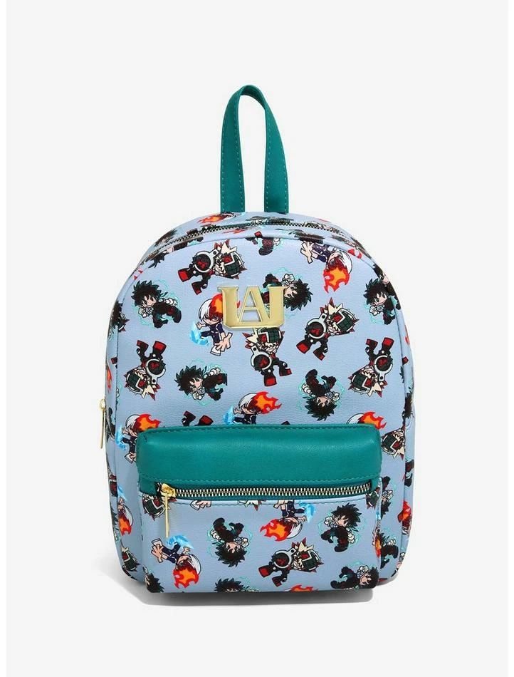 Ready for some Plus Ultra cuteness? This faux leather mini backpack features an allover print of chibi Deku, Todoroki and Bakugo. There is a metal embellishment of the U.A. High logo on the front. Adjustable straps, front zipper pocket and interior drop pocket.
