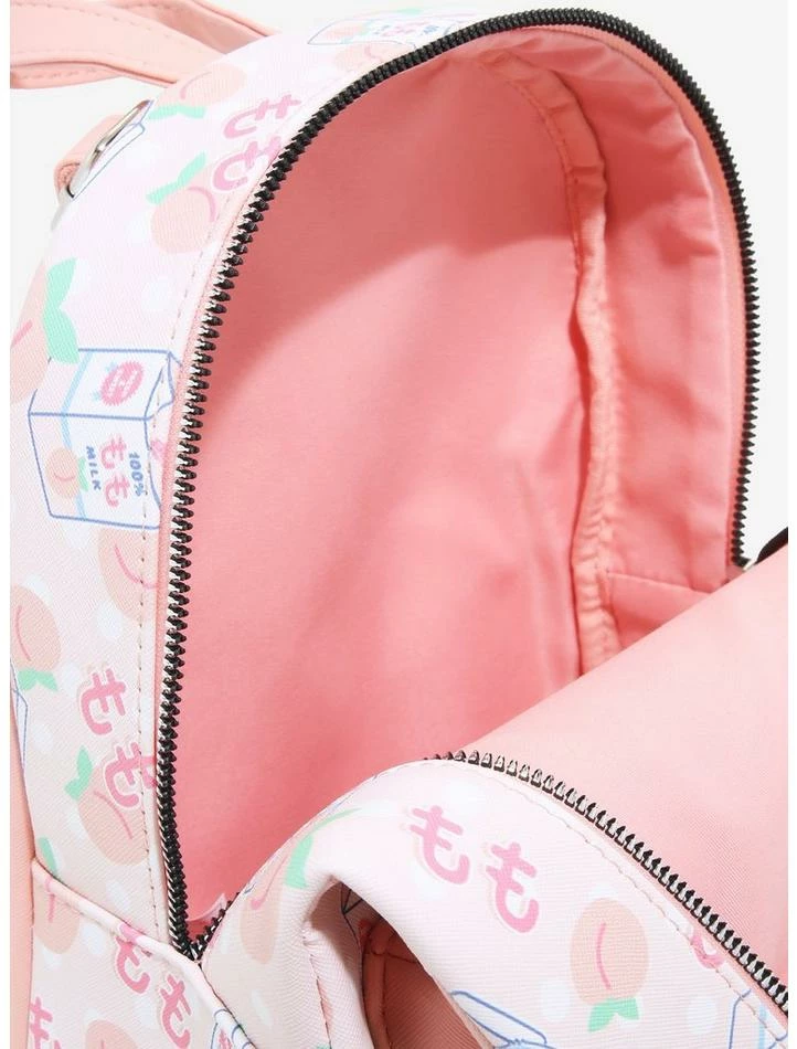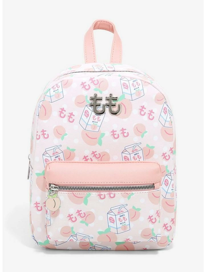 Stuff all the peaches you want into this mini backpack! Straight out of your pastel dreams, this backpack has an allover print of peaches, peach milk cartons and Japanese text, with an enamel peach zipper pull on the front pocket and an embossed logo. Adjustable straps and silver tone hardware.