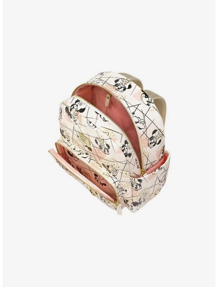 We’ve outfitted our Mini Backpack in the sweet and fashionable Shimmery Minnie Mouse print, featuring playful artwork with blush and metallic gold accents. The vanilla-colored vegan leatherette features golden hardware and leather zipper pulls. Includes the Shimmery Minnie collection’s signature Minnie Mouse keychain.Β
