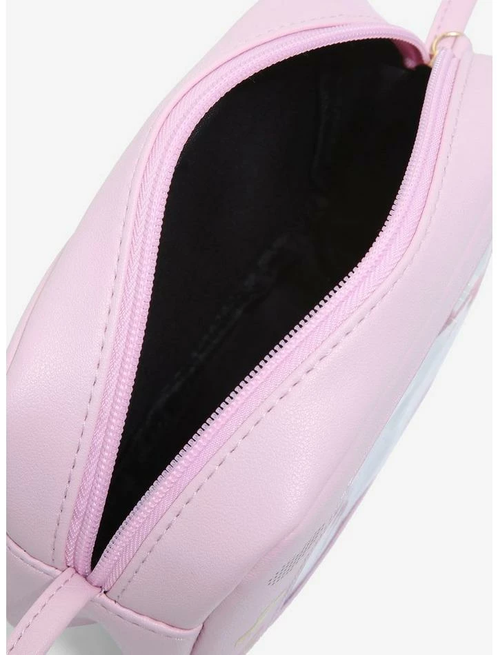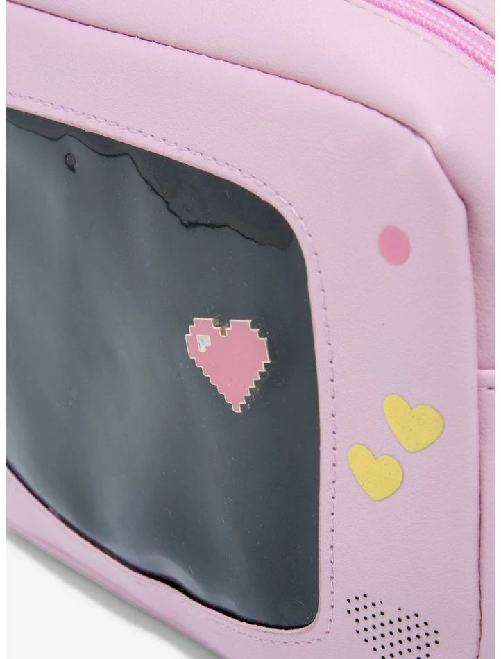 It’s game over for other bags, this one will definitely be your new fave! Show off your pin collection in this pink crossbody bag, featuring a body shaped like a gaming console. Inside includes a removable divider so you can rearrange your pins with ease. Comes with a pixelated heart pin to get your pin game started! Top zipper closure, clear front window.