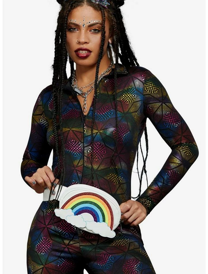 Spread joy and keep your goodies safe with this rianbow fanny pack. Zip closure and adjustable strap.
