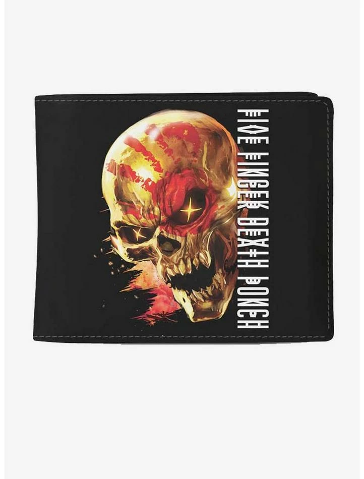 Keep your cash and cards organized in this classic Five Finger Death Punch wallet. Each wallet features a secure coin pocket with zipper, spacious cash and receipt pocket, and five close-fitting card slots. Crafted from extremely durable PU material by Rocksax!