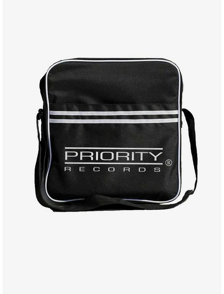 This Priority Records zip top messenger bag can hold 35, 12-inch records and features an outer pouch pocket, and is individually lined. Load up the spacious main compartment and adjust the strap to carry your daily essentials in comfort.