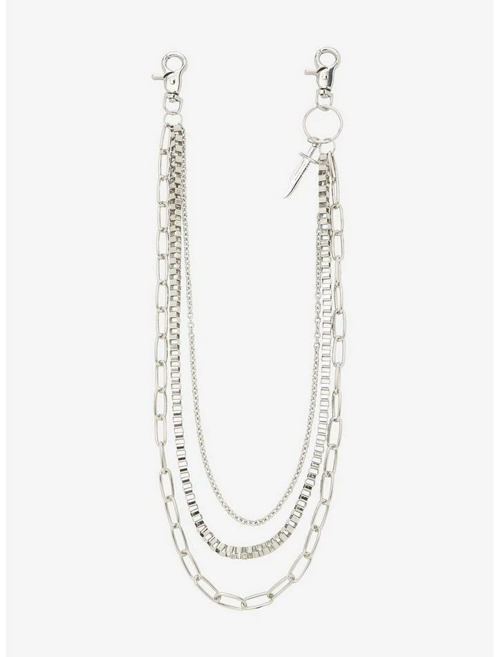 Make your outfit sharp as ever with this multi-layered wallet chain! Featuring three different silver-tone chains with a dagger charm, plus two swiveling lobster claw hooks on both ends.